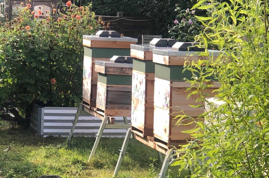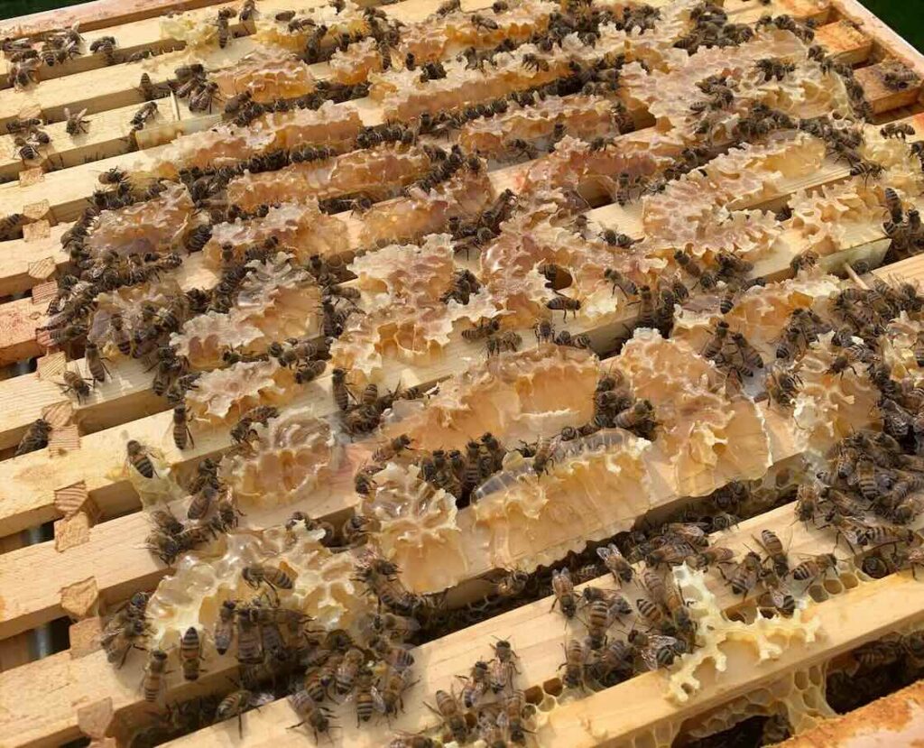 This is the busiest time in the hives. We add extra space for the bees so they can store nectar and ripen it into honey throughout the warm months